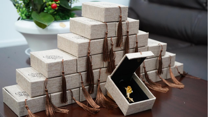 学院工会还为女教职工准备了一份节日惊喜——鱼形胸针。金黄色的鱼形胸针躺在黑色丝绒上,鳞片层叠如波,鱼尾微翘似跃出水面,阳光一照便流转出细碎鎏金,寓意如鱼得水,愿女教职工们在工作和生活中皆能自在顺遂,绽放光彩。