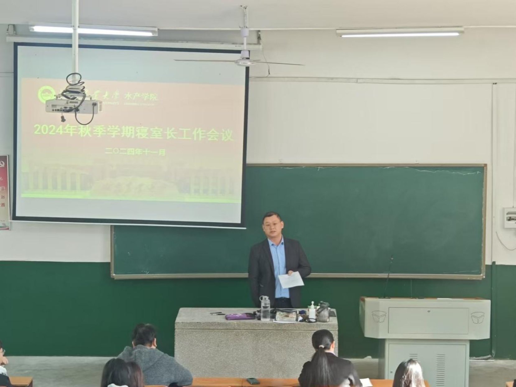 2024 年 11 月 29 日,水产学院寝室长工作会议在老t5教室召开。此次会议旨在进一步优化寝室管理,营造安全、卫生、和谐且富有文化氛围的寝室环境。学院党总支副书记周芳、团委书记何玲、学工办主任杨雄、辅导员彭雨欣出席会议,全体本科生和研究生寝室长参加。