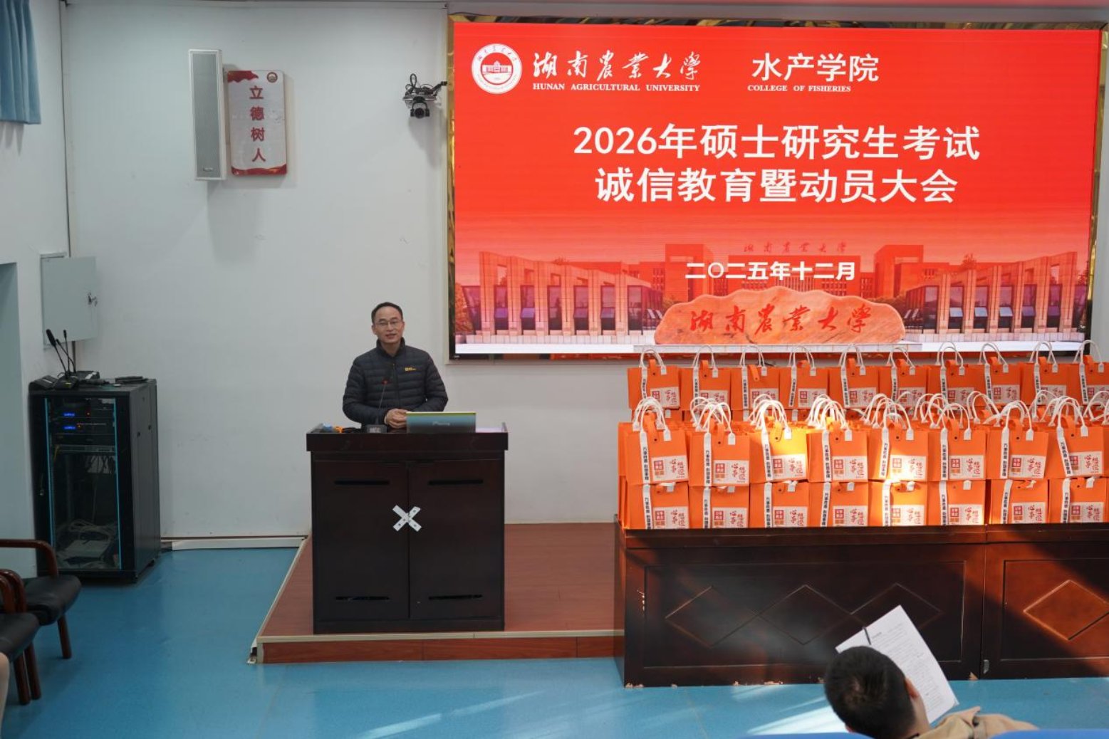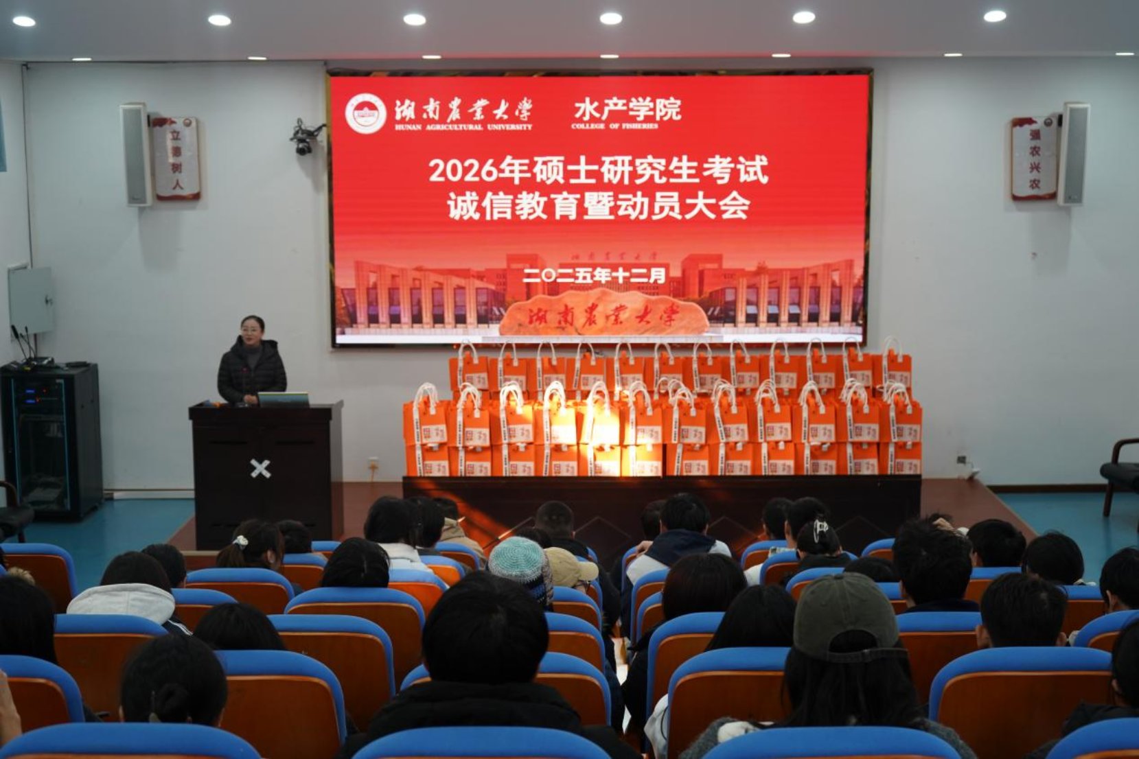 为提升2026届毕业生考研信心,做好诚信考试教育,2025年12月17日上午,湖南农业大学水产学院于老T6教室举办2026年硕士研究生考试诚信教育暨动员大会。院长李德亮教授、副书记周芳老师、渔业资源系李鸿教授和学工办杨哲博士出席,会议由学工办李沫霖老师主持,2026届全体考研学生参加。