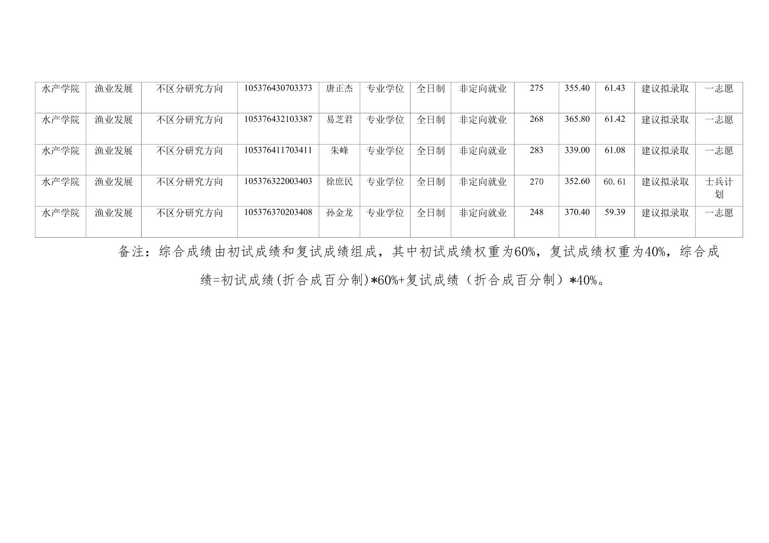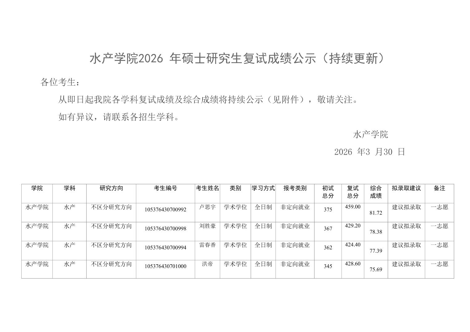 水产学院 2026 年硕士研究生复试成绩公示(持续更新)