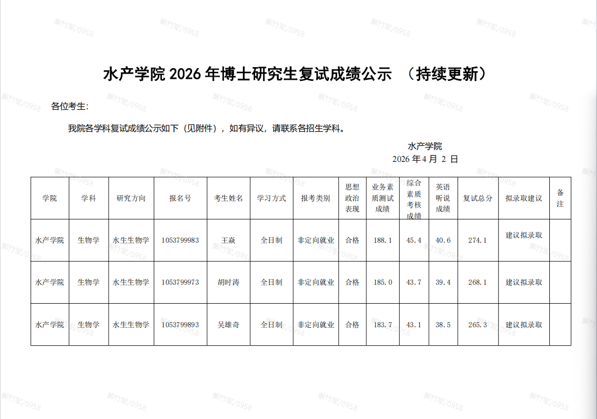 水产学院 2026 年博士研究生复试成绩公示 (持续更新)