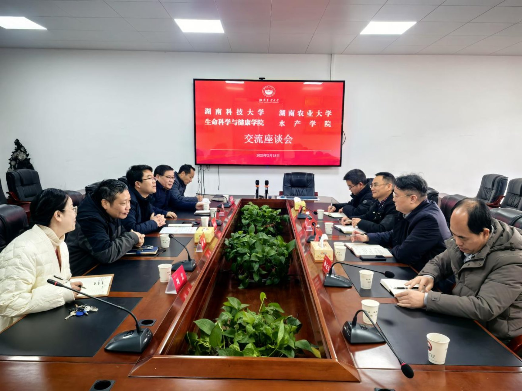 2025年2月18日,湖南科技大学生命科学与健康学院陈宇顺院长一行莅临水产学院,双方在就创楼201会议室进行了深入的交流座谈,水产学院全体班子成员参加会议。