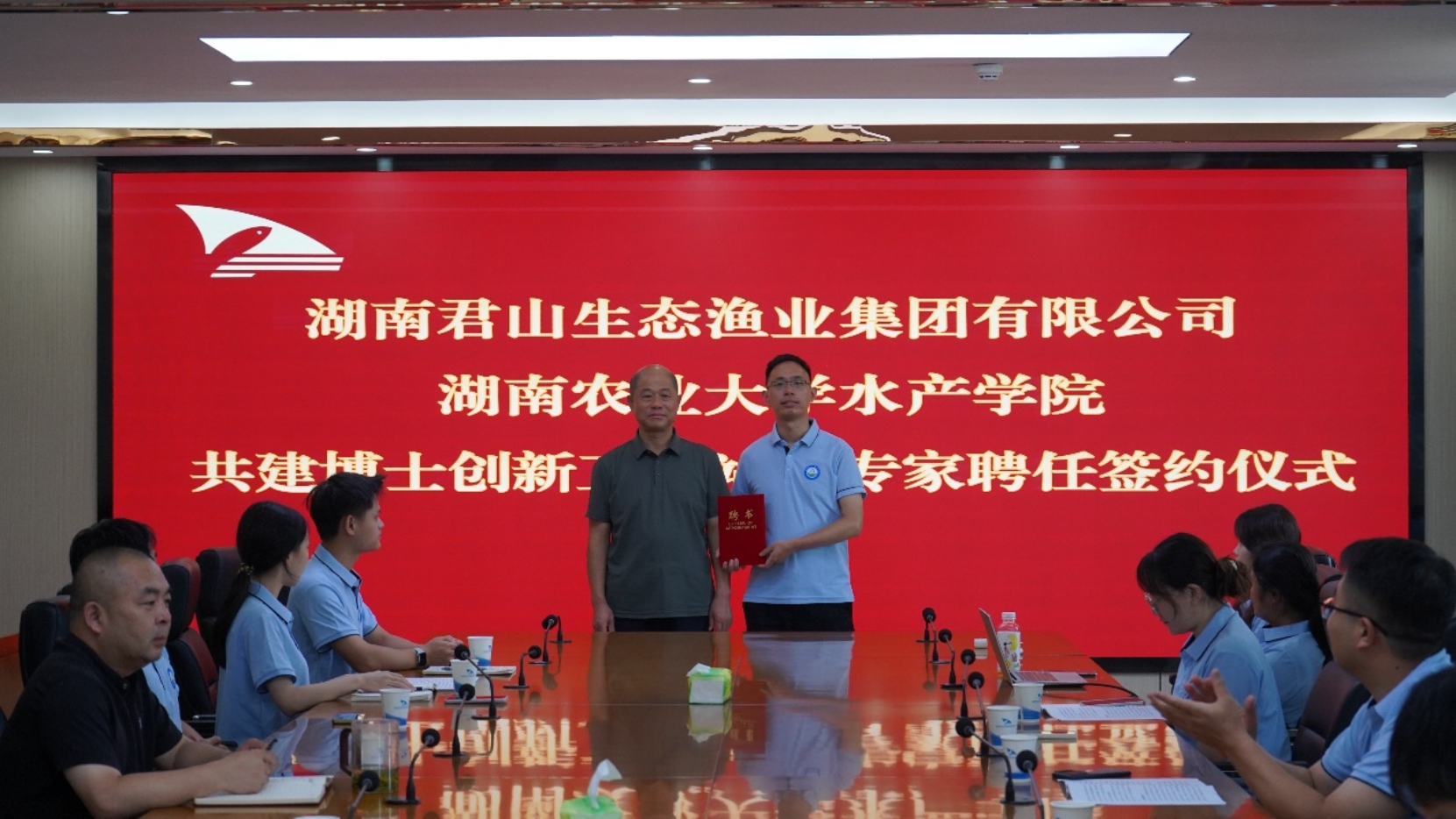 2025年7月10日,湖南农业大学水产学院与湖南君山生态渔业集团有限公司共建博士创新工作站暨张健博士特聘专家聘任签约仪式在公司四楼会议厅隆重举行。湖南农业大学水产学院院长李德亮、党委副书记周芳、黄艳飞副教授、刘新华副教授、龚宇舟博士、何丽博士、彭雨欣老师,湖南君山生态渔业集团有限公司总经理蔡玉刚、副总经理彭滔、生产技术部部长彭淇、杨涛等共同见证本次签约仪式。