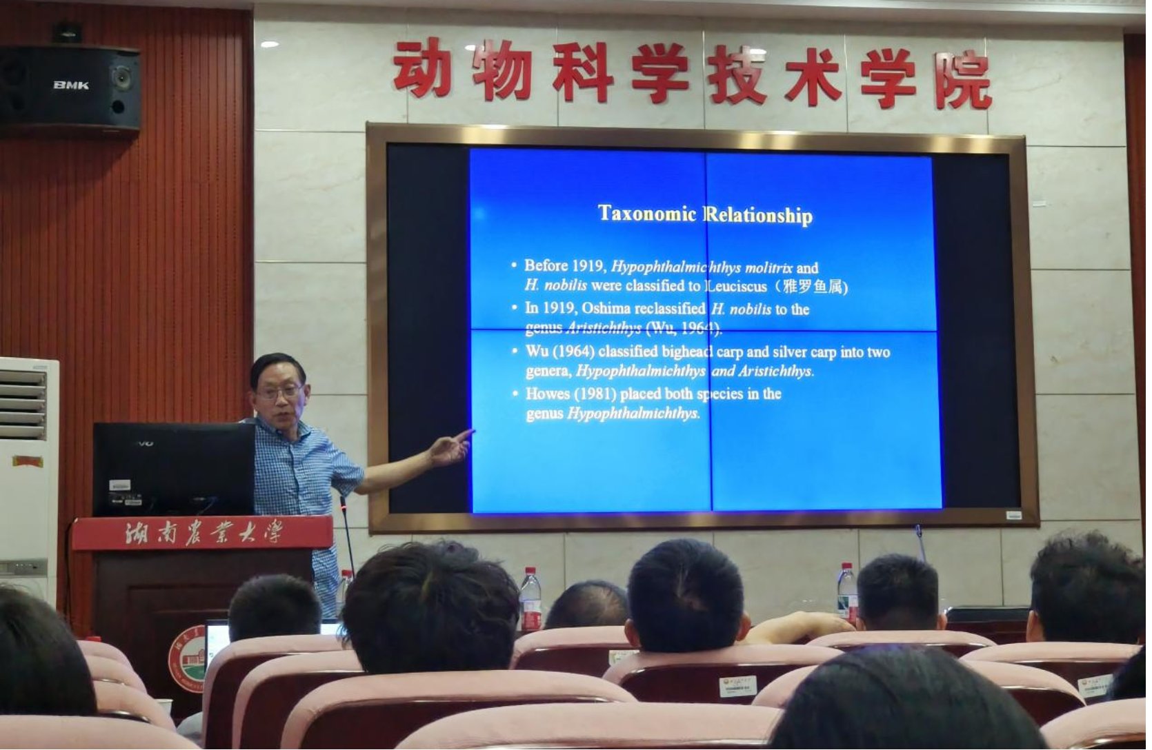 吕国庆教授作题为《鲢、鳙的遗传学与进化:本土保护与入侵防控》的学术报告。报告详细介绍了鲢、鳙的分类地位,生物学特性与分布特征,通过种群遗传学研究揭示我国本土长江鲢、鳙种群遗传多样性显著高于珠江和黑龙江种群,且不同江段种群存在显著遗传差异,美国密西西比河流域等入侵种群遗传多样性也较为丰富、但遗传结构较弱。吕国庆教授还就美国引入鲢、鳙后,对本土水生生物造成威胁,带来的严峻生态问题,以及美国政府采取的措施进行了详细的介绍。最后在互动环节中,师生踊跃提问,围绕遗传多样性与生物进化的关系,不同的水产动物在不同地区入侵的现象等话题,与吕教授展开了深入的交流。