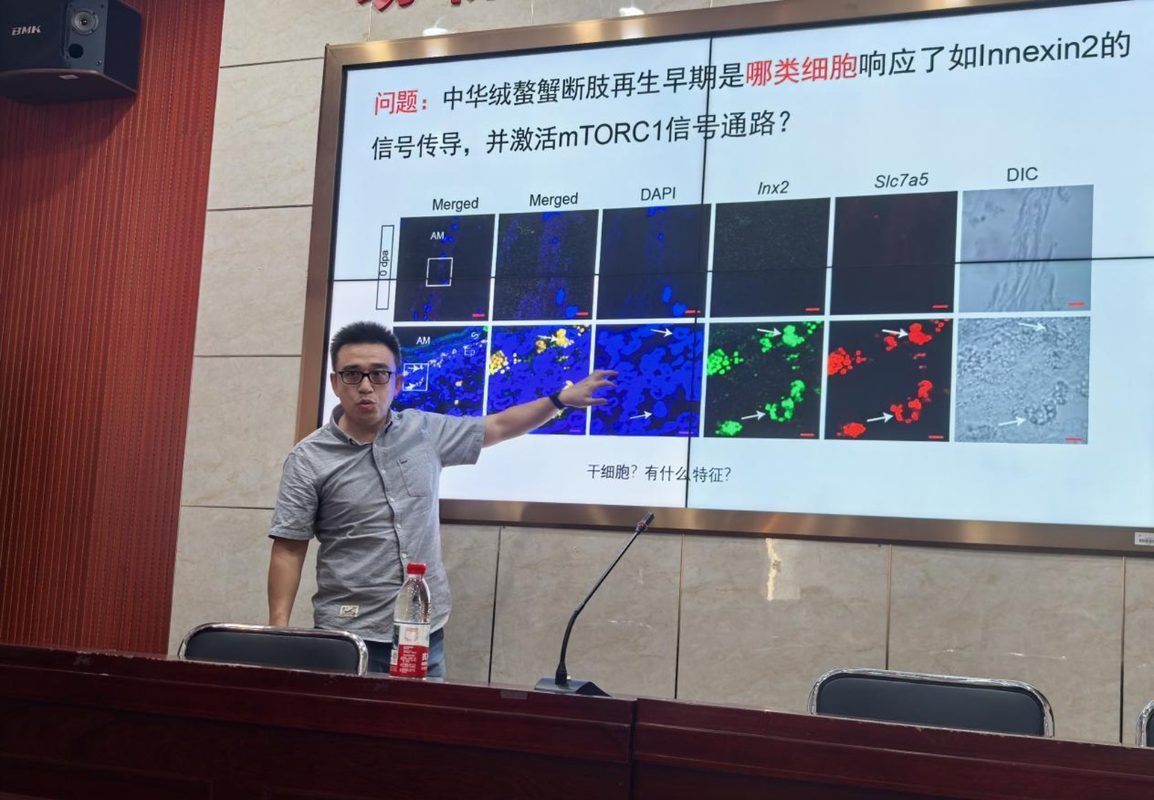 王军副教授作题为《中华绒螯蟹断肢再生的分子基础》的学术报告。王军副教授介绍了其团队克服了中华绒螯蟹染色体数目多(2n=146),基因组重复序列高,组装困难的难题,获得了染色体水平的精细基因组图谱,继而进行了比较基因组学分析,鉴别出节肢动物特有的基因和基因家族。发现Innexin基因家族在中华绒螯蟹断肢再生的早期发挥重要的分子信号传导作用,其中Innexin2基因在断肢后1天内特异的表达上调,且通过调控mTORC1信号通路和免疫应答反应,介导中华绒螯蟹的断肢再生过程。还发现节肢动物特异的SMYDA基因家族在中华绒螯蟹涉及明显形态发生的生物学过程(如变态、再生)中发挥重要的表观修饰作用。这些发现不仅为解决养殖中“断肢蟹品相差、产值低”的产业痛点提供了新思路,也加深了对动物器官再生机制的理解。现场师生围绕动物的器官再生、如何提出好的科学问题,推动研究工作不断深入,与王军老师进行了热烈的互动。