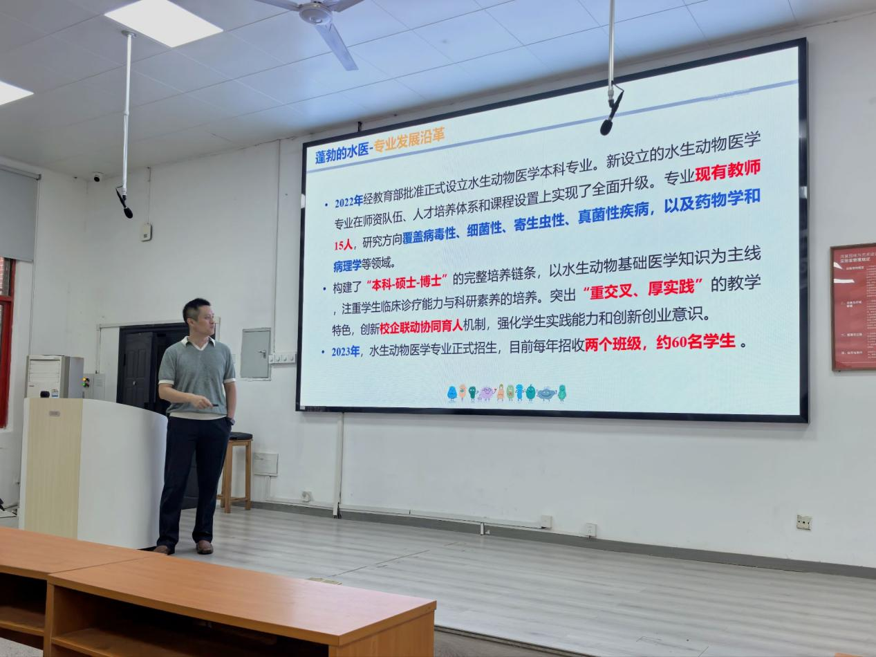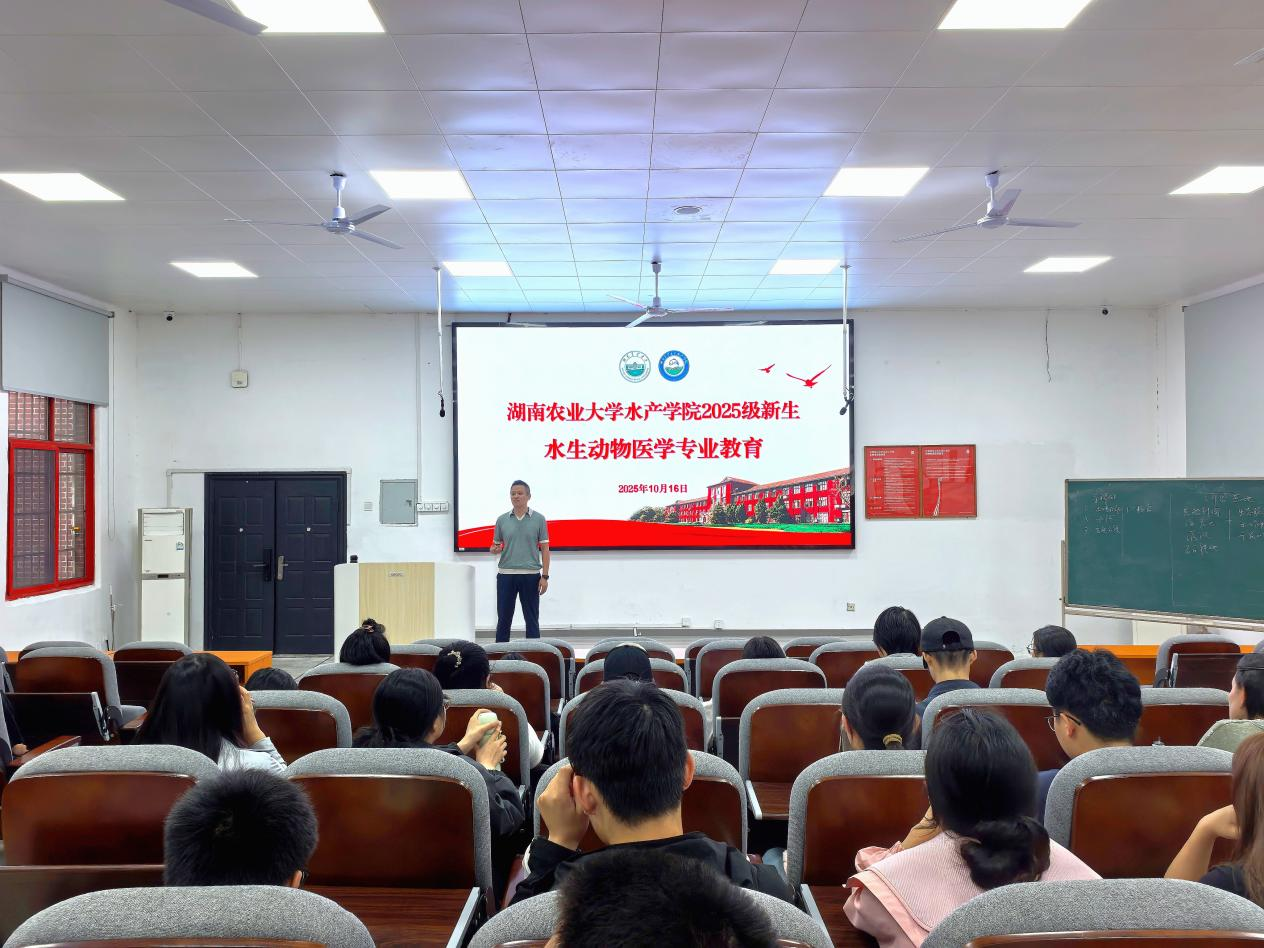 2025年10月16日,湖南农业大学水产学院在老T2教室举行了水生动物医学专业教育,讲座由水生动物医学专业负责人高志鹏教授主讲,全体2025级水生动物医学专业学生参加。