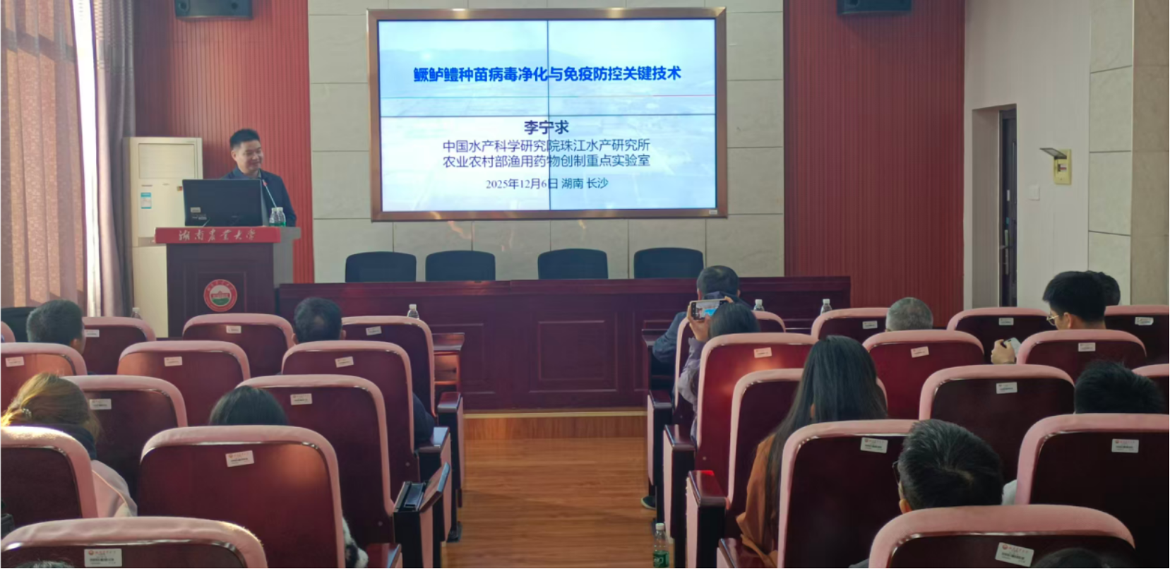 2025年12月6日下午,湖南农业大学水产学院《湘农水产》学术论坛在2教501会议室成功举行。本次论坛邀请到了我校97级优秀校友、中国水产科学研究院珠江水产研究所李宁求研究员作题为《鳜鲈鳢种苗病毒净化与免疫防控关键技术》的学术报告。报告会由学院党委书记戴荣四主持,李军华副院长等师生参会。